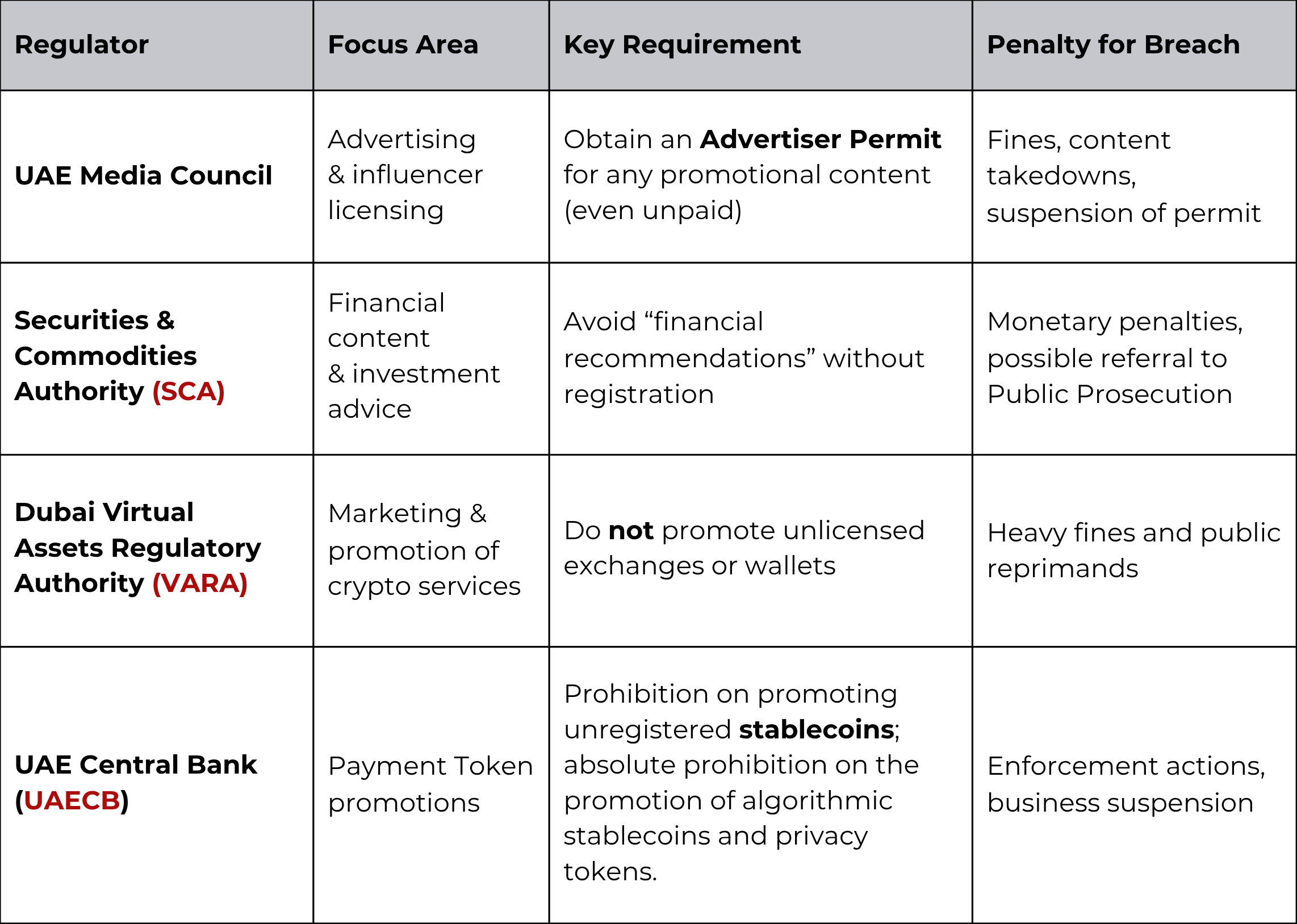 Four regulators: VARA, SCA, the UAE Media Council, and the UAE Central Bank – can have jurisdiction over what you publish. Missing a disclosure or tagging an unlicensed exchange can result in fines or even suspension of activity.