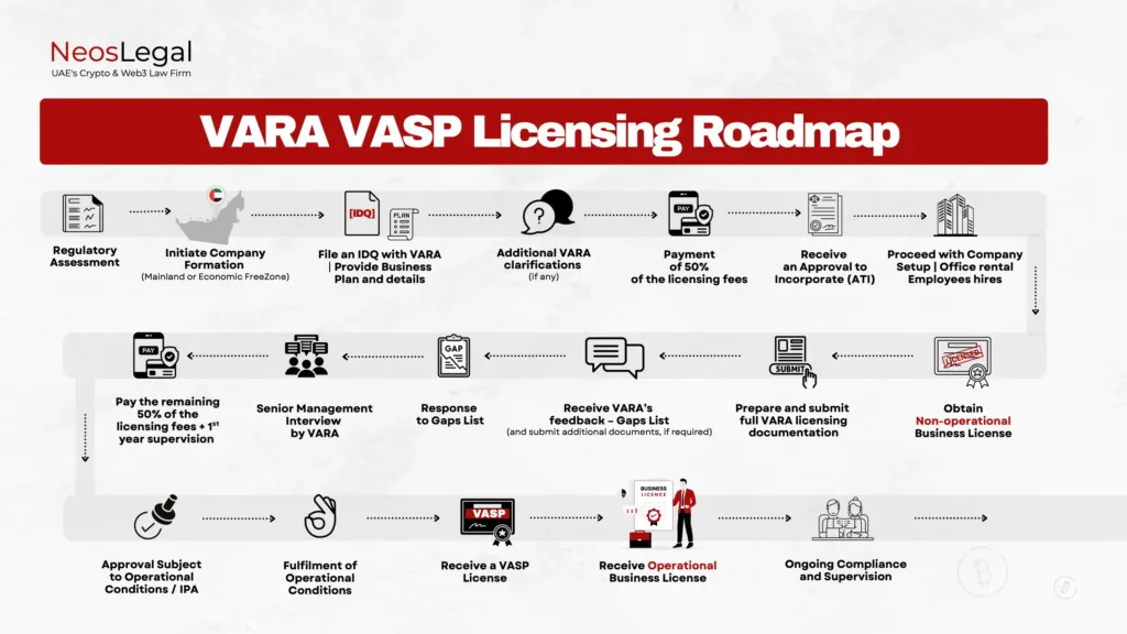 Securing a VASP licence in the UAE is a structured journey that turns a crypto concept into a compliant, bankable business. The map below outlines VARA licensing pathway, which is one of the most comprehensive and structured approaches on the market to-date, showing how founders move from early-stage planning to full operational approval.